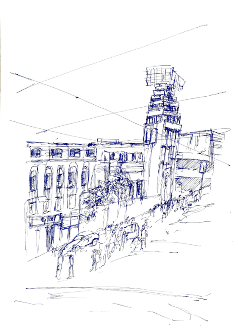 Exterior drawing is the practice of sketching the urban environment from observation. Identifying a subject/focal point, composition, values, colour, rendering techniques and exploring various styles are all a part of the exterior drawing curriculum. The practice of sketching strengthens these fundamentals and helps build the foundation to create and evocative and emotive picture.