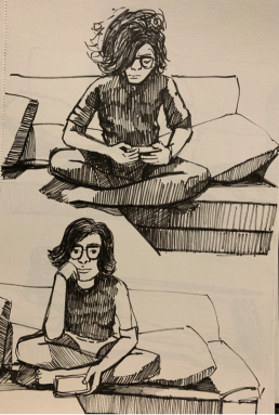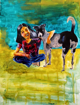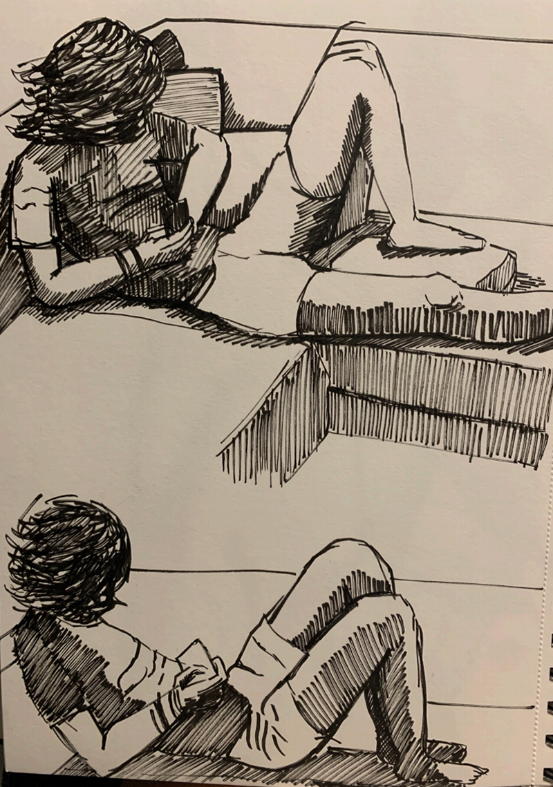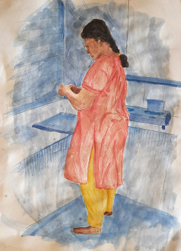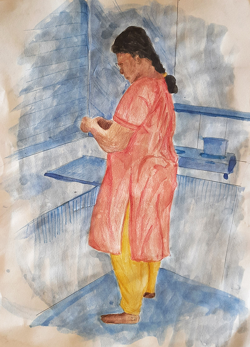 Students were advised to study their own hands and legs and their self image from the mirror. Students learnt observation,proportions,space divisions, use of different materials like pencil, charcoal,watercolour,gouache,pen and ink etc. Family members also took the role of posing as models.
